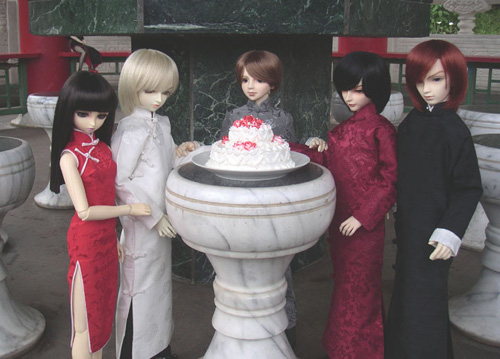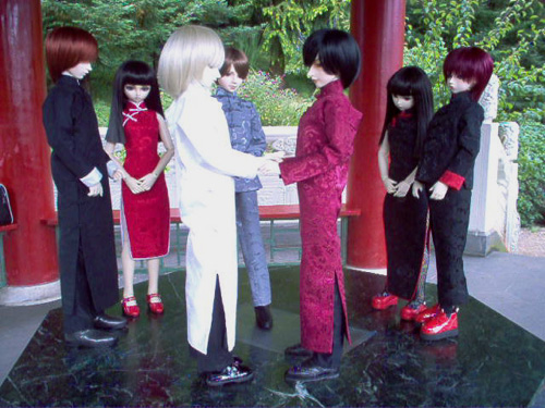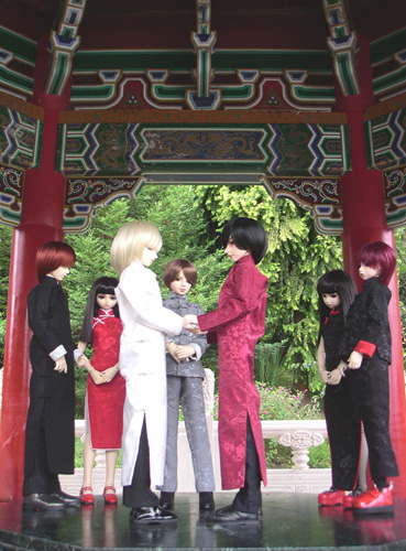 The bride, groom, witnesses and minister around the gorgeous cake decorated by our great friend, aznbutterfly. Thank you so much, Devon! Thanks also go to Devon for all the beautiful clothing worn by the adults and many of the better pictures!